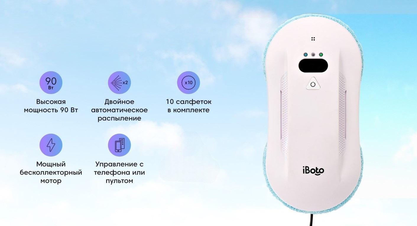 Робот мойщик окон с распылением с двух сторон от специализированного на робототехнике бренда iBoto – это идеальный робот мойщик, чтобы экономить вам время и деньги на мытье окон, безопасно мыть любую вертикальную и горизонтальную поверхность в квартире или доме: окна, зеркала и многое другое, не оставляя разводов, не царапая и не повреждая поверхность! Робот мойщик будет прекрасным помощником в решении проблемы безопасного мытья окон от 30 см на высоких этажах!