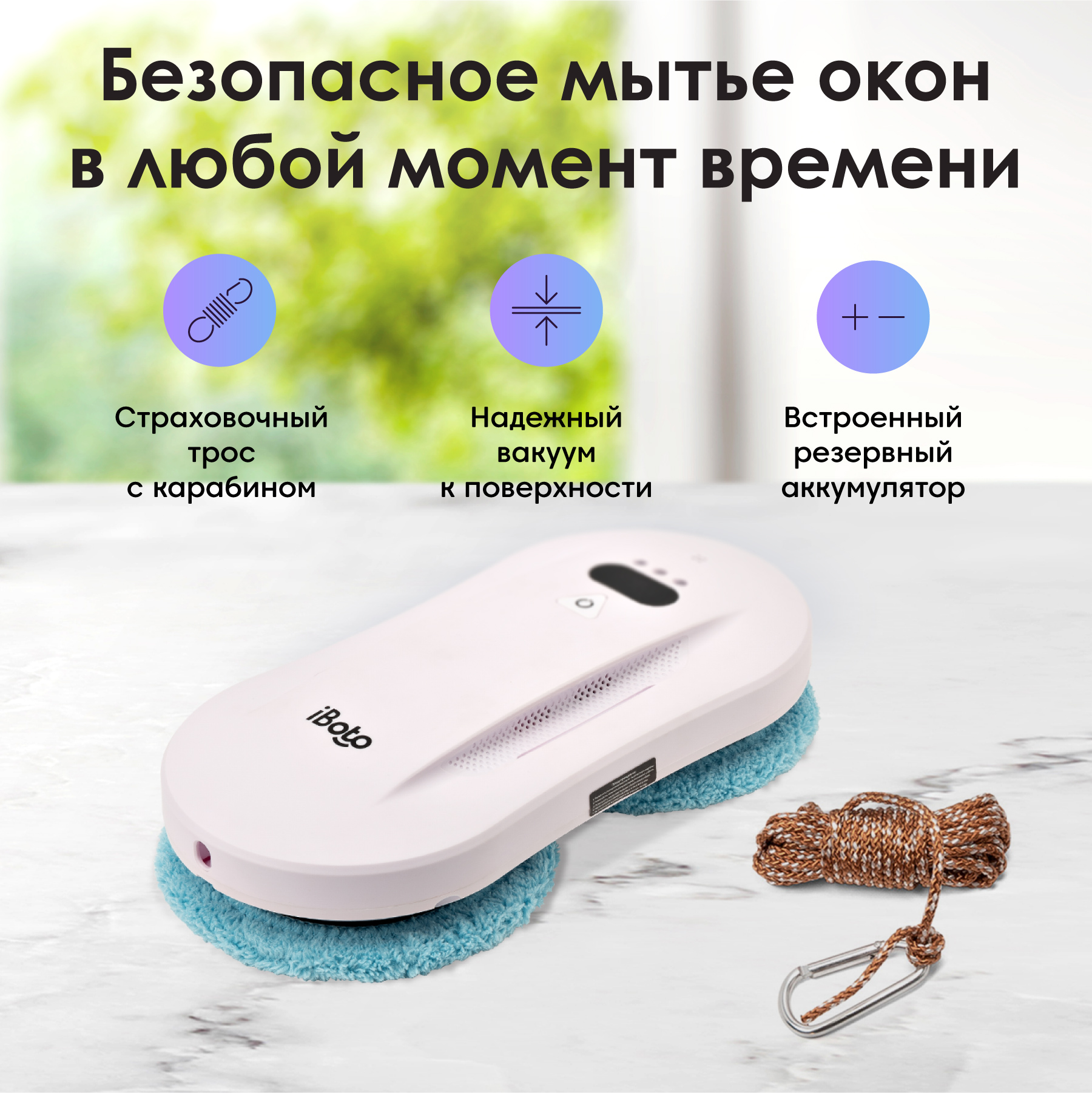 Благодаря мощному вакууму, робот для окон iBoto Win 396 надежно прикрепляется к любой поверхности, закрепляется страховочным тросом (общая длина с кабелем, адаптером и тросом – 7.5 м), а также имеет встроенный аккумулятор резервного питания на 30 минут на случай перебоя с электричеством